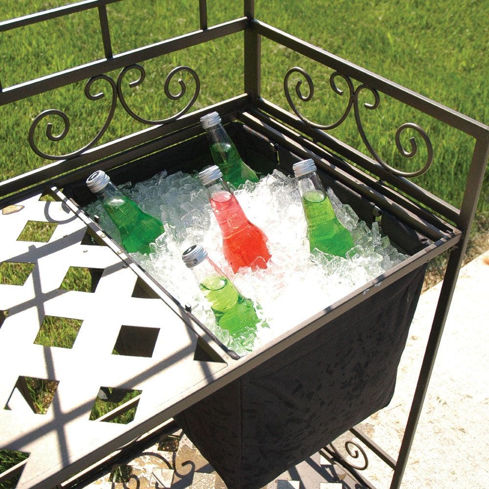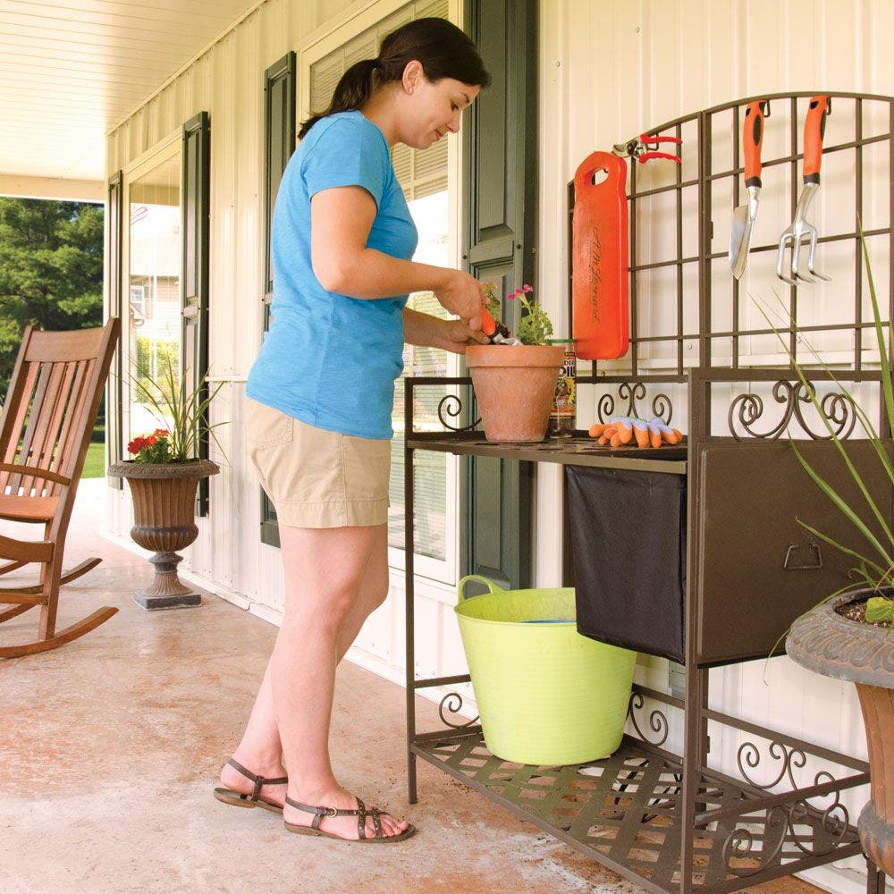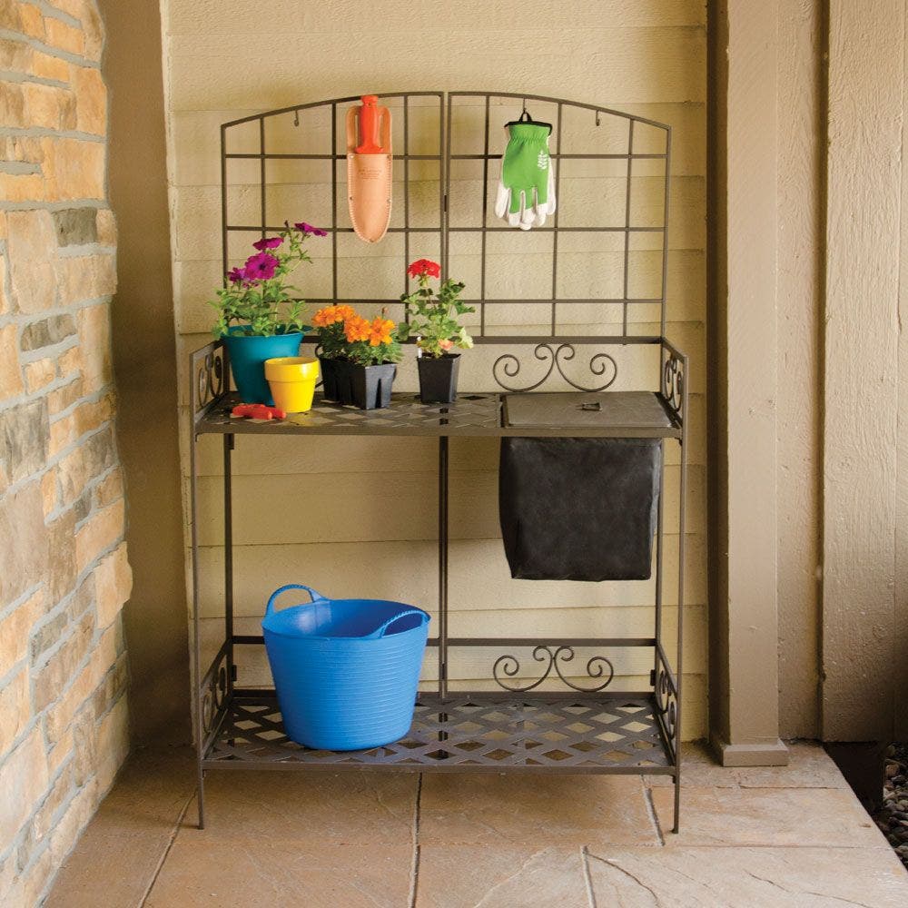 - For indoor or outdoor use Includes a removable canvas soil reservoir Has hooks for hanging tools Diamond-pattern holes punched in the table allow drainage; no water puddles